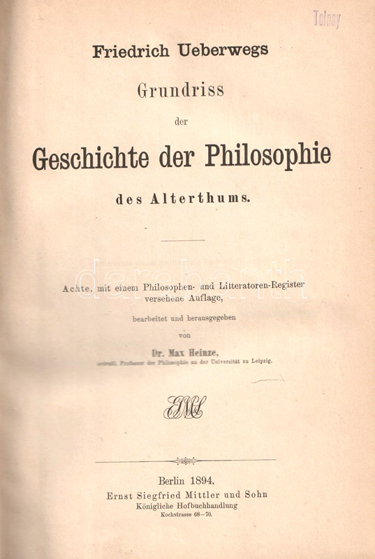 Ueberweg, Friedrich: Grundriss der Geschichte der Philosophie. Herausgegeben von Max Heinze. Theil 1-4. [Teljes mű négy részben; két kötetbe kötve.]