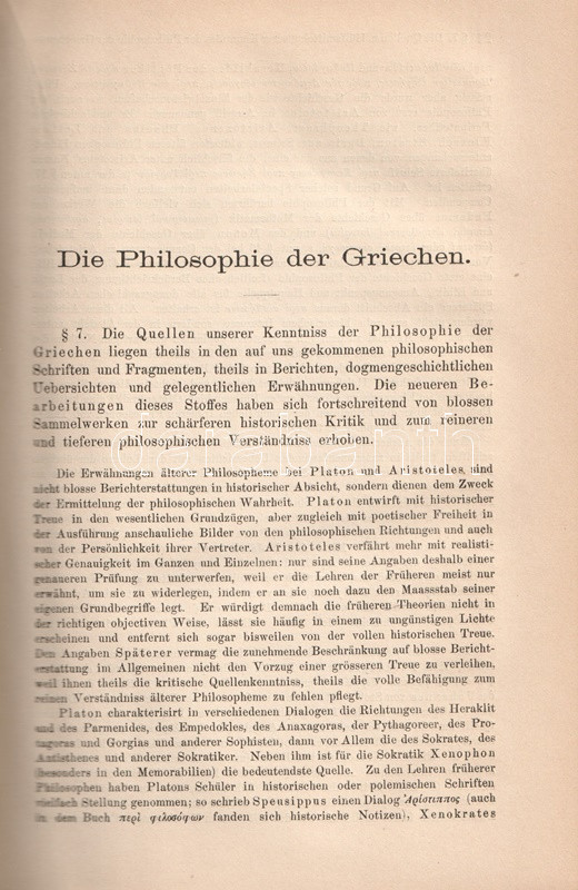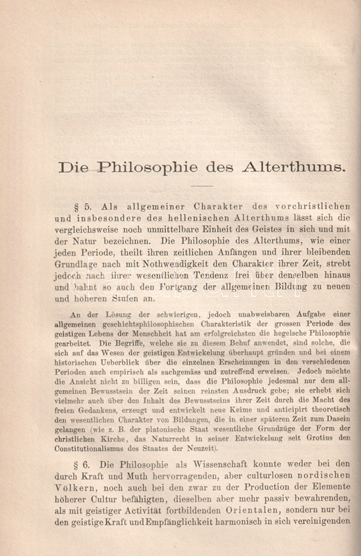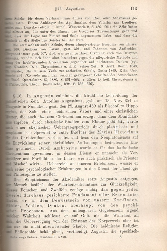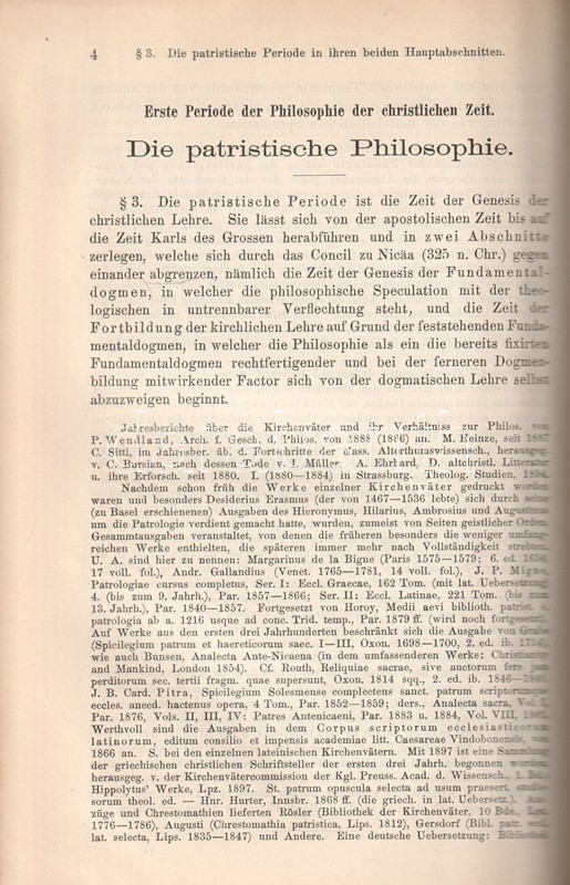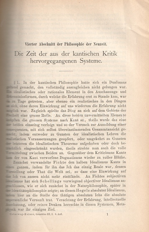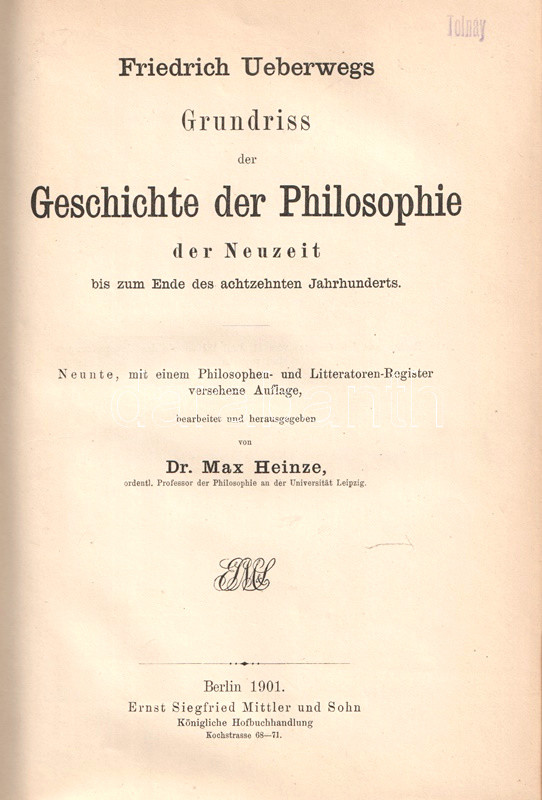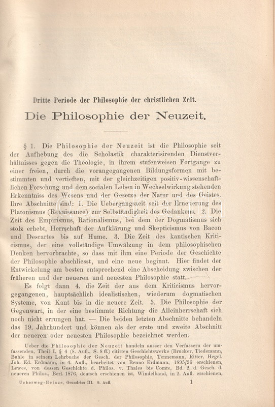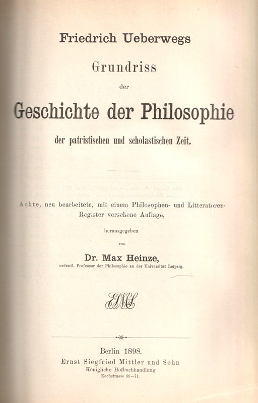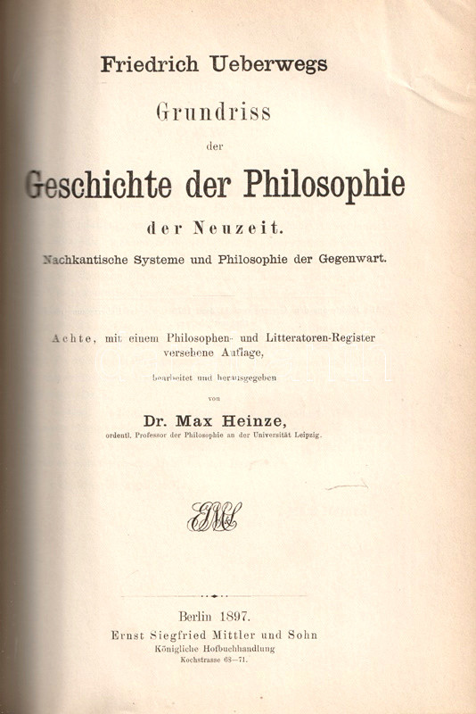 Friedrich Ueberweg (1826-1874) német filozófus filozófiatörténeti monográfiája először 1863-1866 között jelent meg, három kötetben. A számtalanszor átdolgozott és bővített történeti áttekintés a századfordulóra elérte 8. kiadását (példányunk is ebből a kiadásból való), és a tudásanyag bővülése miatt már négykötetnyi tárgyalást kívánt.