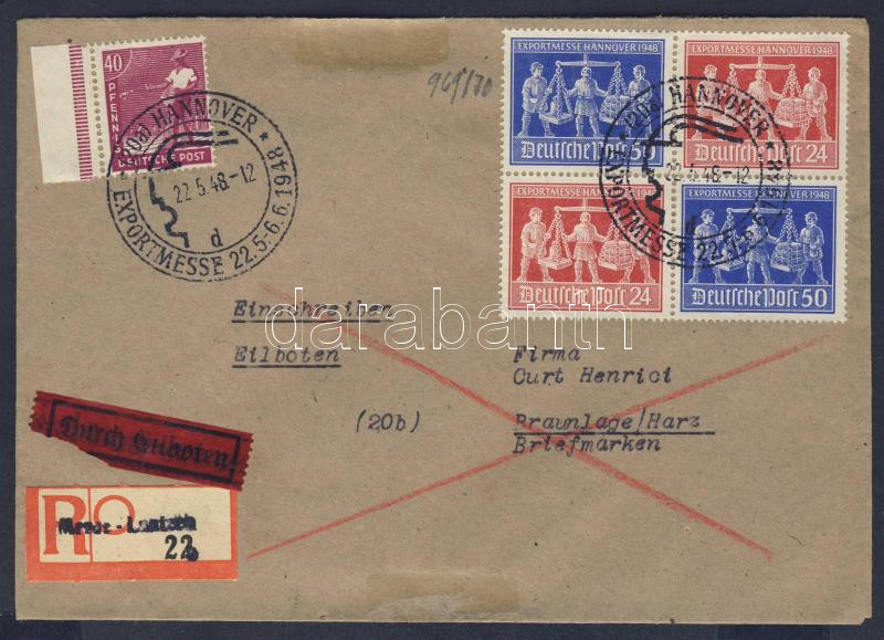 Németország szövetséges megszállás 1948 Hannoveri vásár Mi 969-970 2 párt tartalmazó összefüggés díjkiegészítéssel elsőnapi expressz ajánlott levélen
