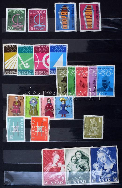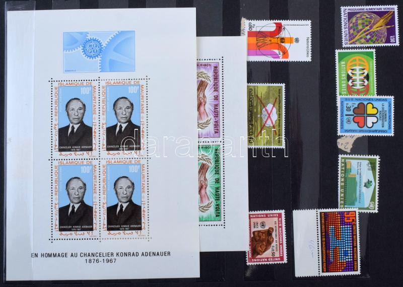 Külföldi bélyegek, közte sorok, blokkok, sok francia és gyarmati postatiszta érdekes, vegyes anyag 8 lapos A4-es berakóban