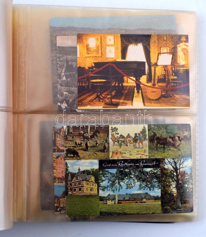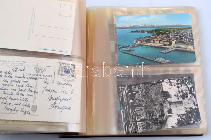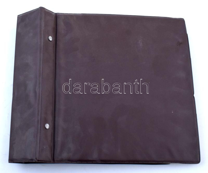100 férőhelyes A4-es levél / képeslap berakó barna csavaros borítóval, benne ~50 db modern külföldi képeslap