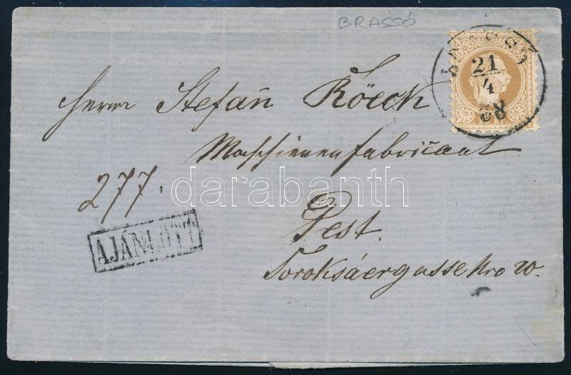 1868 Ajánlott levél 15kr bérmentesítéssel, "BRASSÓ" - "PEST"