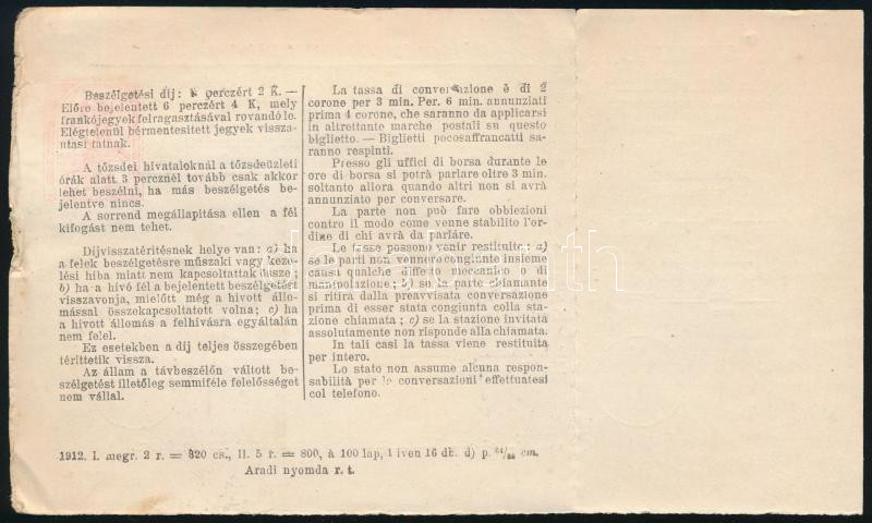 1913 Magyar - OLASZ nyelvű távbeszélő-jegy magán beszélgetéshez 1K Turul bérmentesítéssel "FIUME"