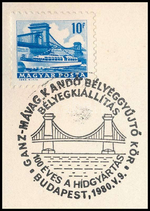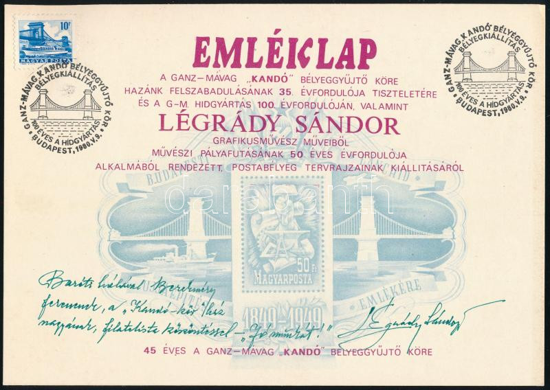 1980 Légrády Sándor grafikusművész pályafutásának 50 éves évfordulójára kiadott, a Lánchíd III. blokkot ábrázoló emléklap, bélyegkiállítási alkalmi bélyegzéssel, Légrády üdvözlő szöveggel és aláírással
