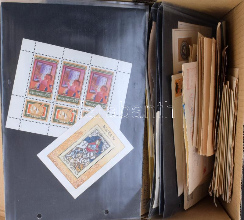 Hullámkarton doboz, benne bélyegújdonságokat tartalmazó borítékok a 60-as 80-as évekből. Rendezésre, átnézésre szoruló anyag érintetlen hagyatékból.