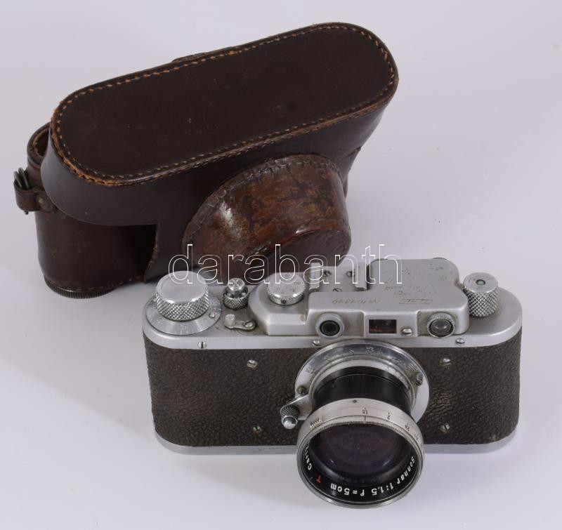 1953-1955 Fed 1 fényképezőgép, Carl Zeiss Jena Sonna 1:1,5 f=5cm objektívvel, szíj nélküli bőr tokjában.