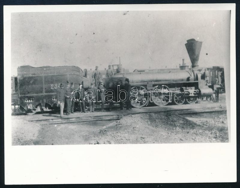 A Déli Vasút 12-es sorozatú mozdonya sátor nélkül az 1860-as években, reprodukció előhívás, hátoldalon feliratozva, 9×12 cm