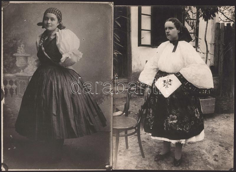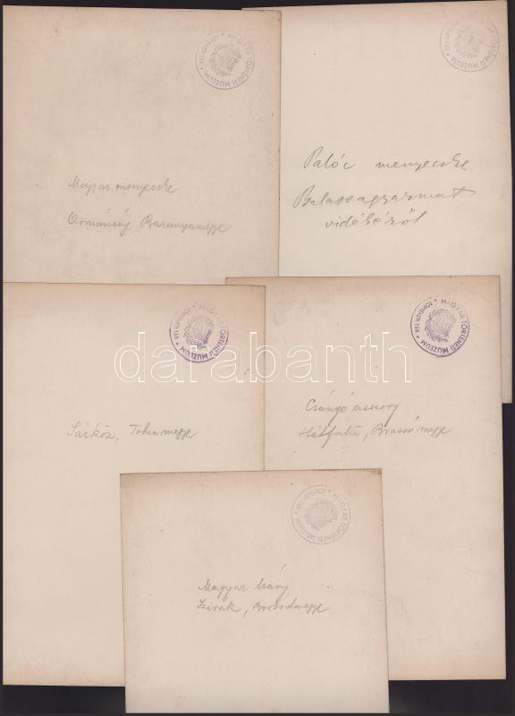Magyar népviseletek (ormánsági, palóc, csángó, sárközi, sziráki), 5 db fekete-fehér fotó, a hátoldalon feliratozva, a Magyar Történeti Múzeum bélyegzőjével, 23x16 cm körüli méretben