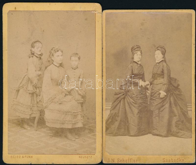 cca 1870-1880 Hölgyportrék, 2 db vizitkártya, Reisz & Funk újvidéki (Neusatz, Novi Sad), illetve J. N. Scheffler szabadkai (Subotica) műterméből, 10,5x6,5 cm és 10x6 cm