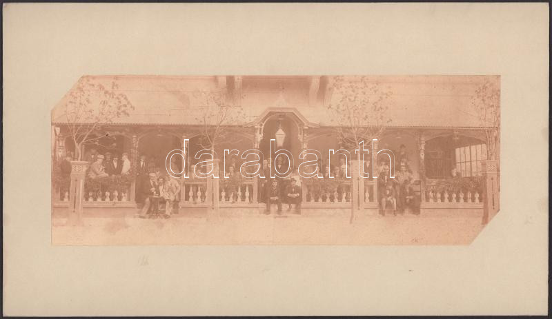 cca 1900 Mosonmagyaróvár, férfiak csoportképe egy épület tornácán, kartonra ragasztott fotó, felületén törésnyom, vágott sarkak, 11×28 cm