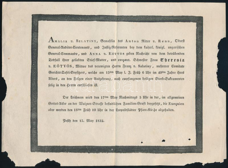 1832 Pest, sárvári Eötvös Teréz (1792-1832), nemeskottesói Szlatényi Ferenc özvegyének halotti értesítője, német nyelven, lapszéli sérülésekkel, kis lyukakkal, 18x24,5 cm