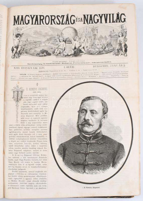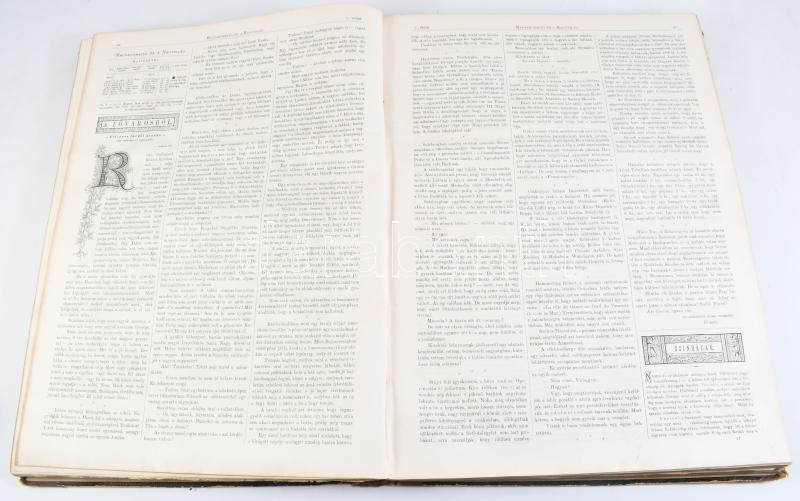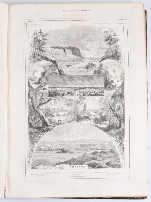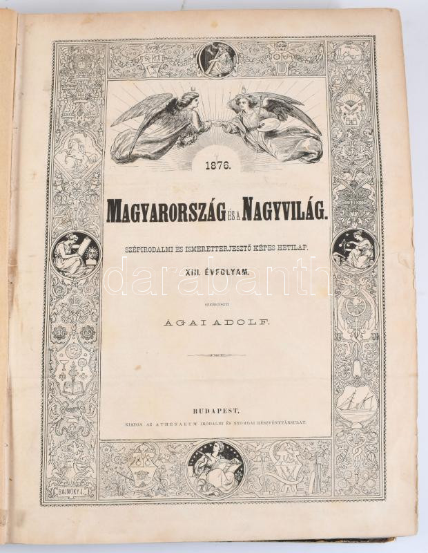 1876 Magyarország és a Nagyvilág. Szépirodalmi és ismeretterjesztő képes hetilap. XIII. évf. 1-53. sz. (Teljes évfolyam, egybekötve.) Szerk.: Ágai Adolf. Bp., Athenaeum, [4]+843+[1] p. Számos fametszetű illusztrációval, reklámokkal. Félvászon-kötésben, viseltes állapotban, sérült, levált gerinccel.