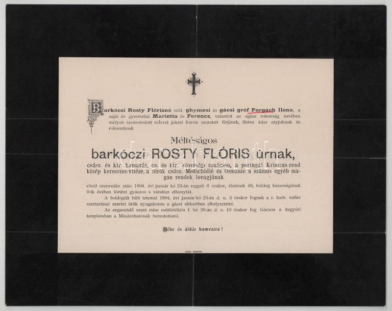 1894 Gács, barkóczi Rosty Flóris (1846-1894) cs. és kir. kamarás, követségi tanácsos halotti értesítője, kis lapszéli szakadásokkal, 23x29 cm
