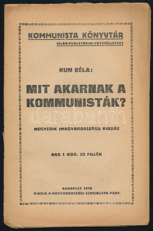 1919 Bp., Kun Béla: Mit akarnak a kommunisták? Kommunista Könyvtár, sérült, 31p