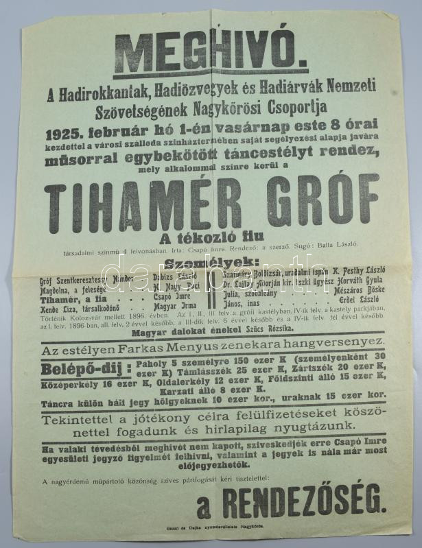 1925 Nagykőrös Hadirokkantak, Hadiözvegyek és Hadiárvák Nemzeti Szövetségének nagykörösi csoportja. Plakát. Színházi előadásra 32x48 cm