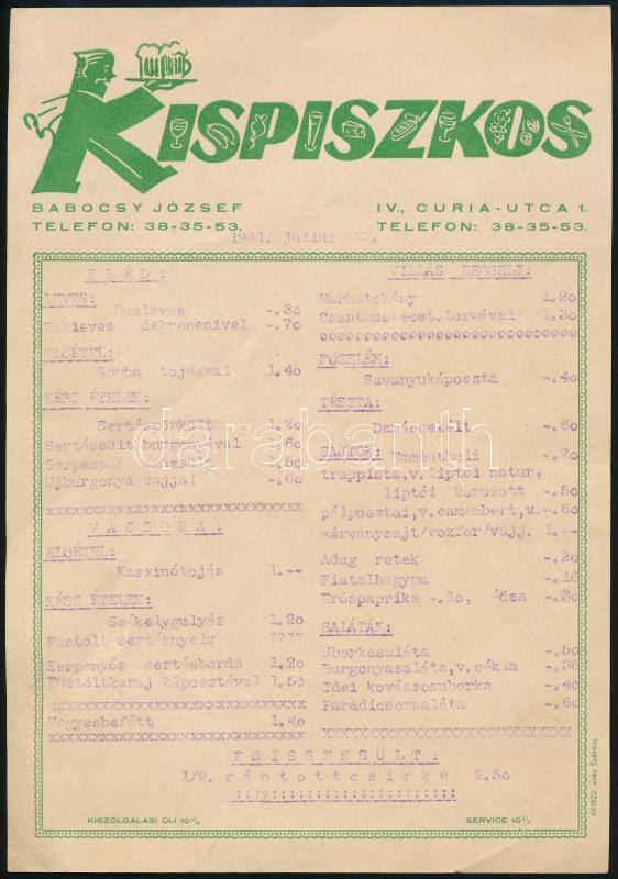 1941 Bp. IV. Curia-utca, Kispiszkos vendéglő étlapja