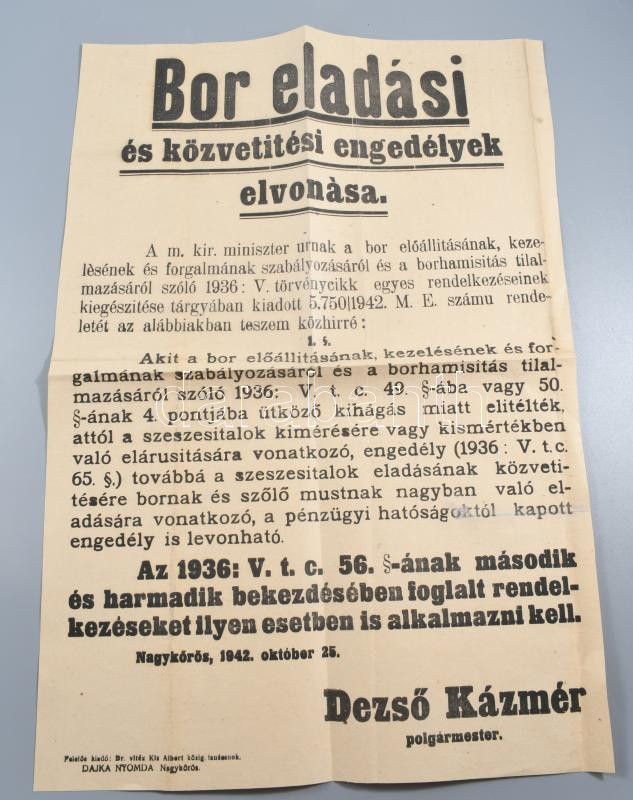 1942 Bor eladási és közvetítési engedélyek elvonása, Nagykőrös plakát. 30x43 cm Hajtva