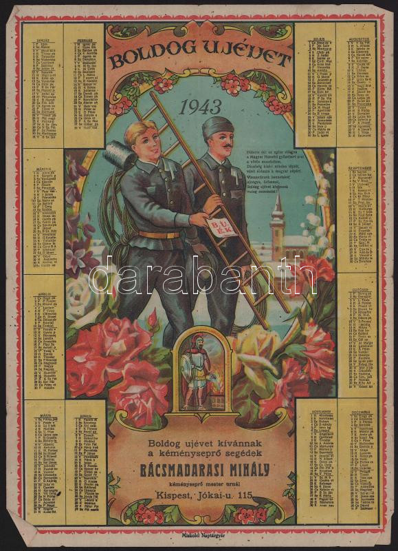 1943 Kispest, "Boldog újévet" kíván Bácsmadarasi Mihály kéményseprő és segédei, naptár, hajtott, 34×24 cm