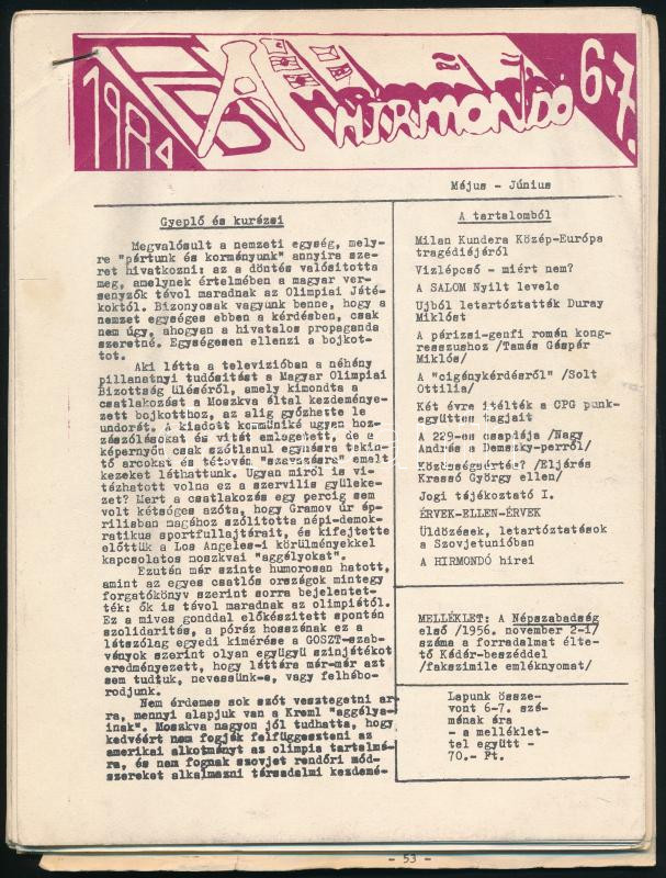 1984 AB Hírmondó c. szamizdat kiadvány 6-7 száma, 1984.május-június 76 p.