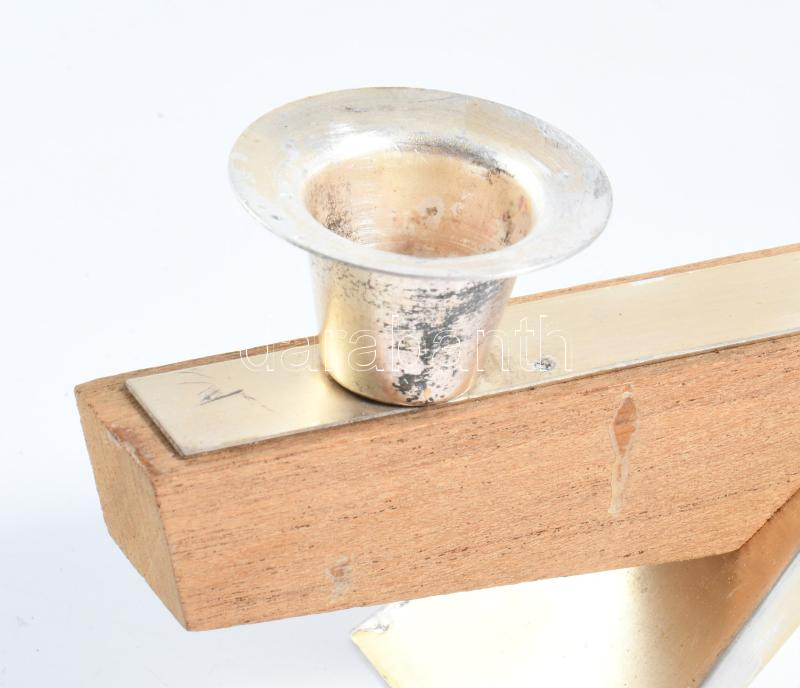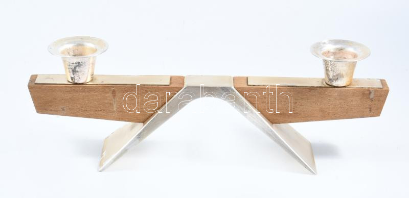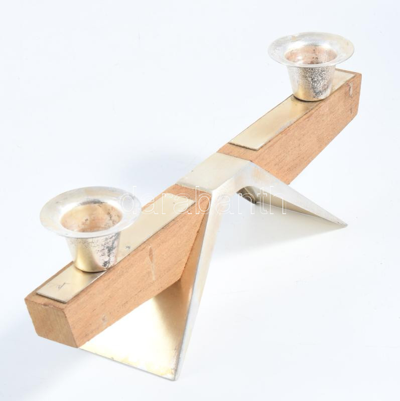 Fém és fa kétágú gyertyatartó, h: 24 cm
