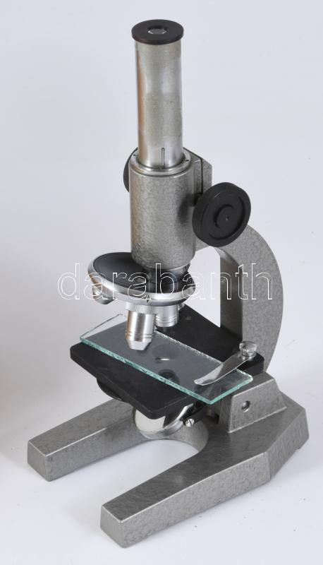 Retro mikroszkóp, jó állapotban, fa dobozban, m: 19 cm