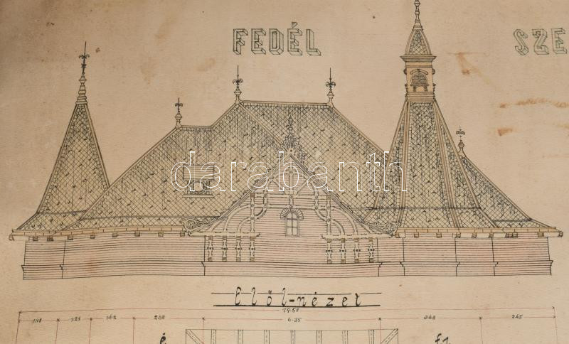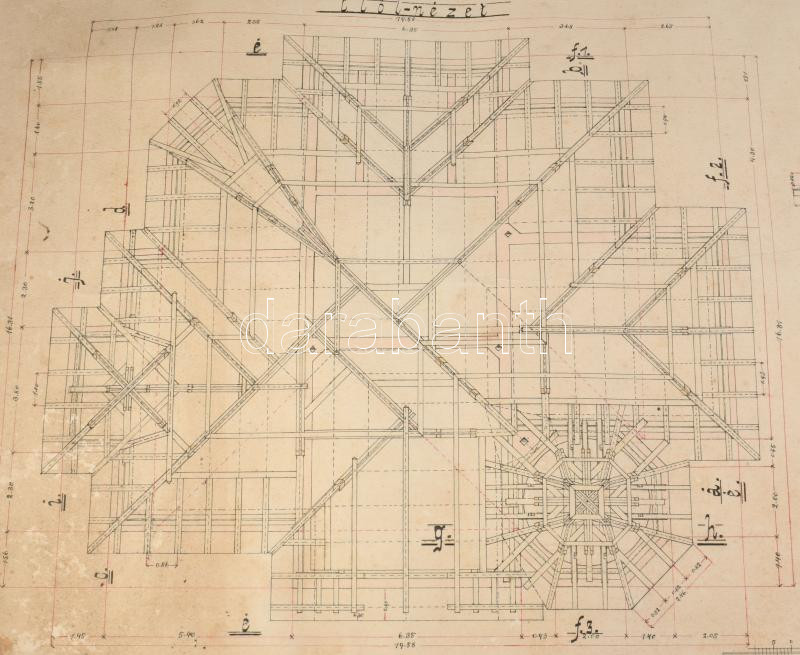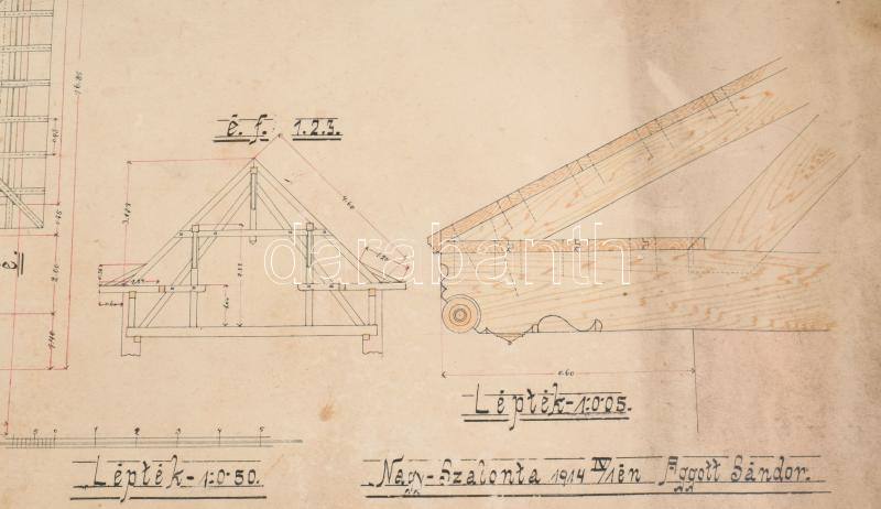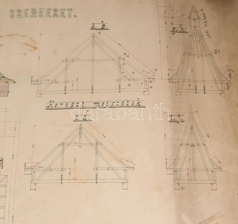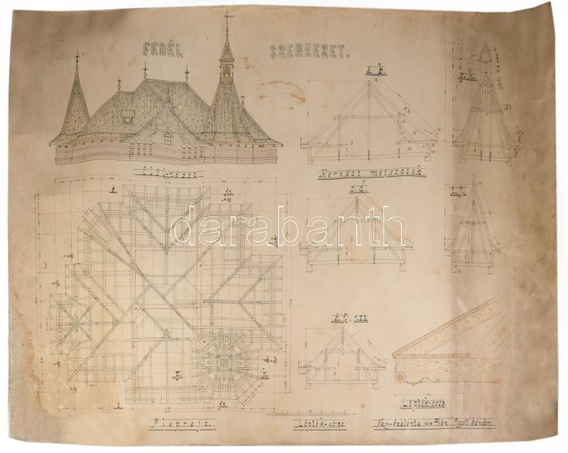 1914 Nagyszalonta, Salonta RO, Erdély. Palota fedélszékének (tetőzetének) nagy méretű tervrajza. Aggott Sándor építész terve. 96x73 cm
