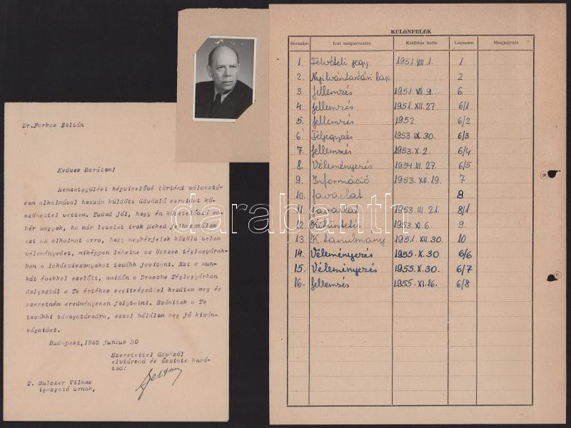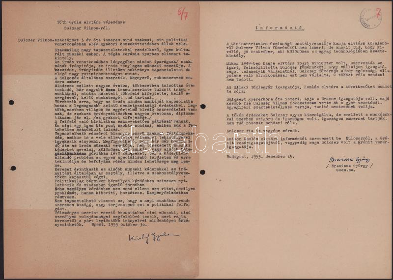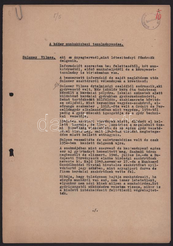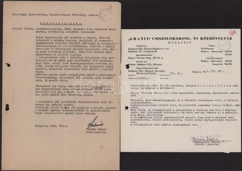 1945-1955 Sulczer Vilmos, a Gránit gyár vezérigazgatójának káderanyaga: szakmai jellemzés, javaslat kitüntetésre, önéletrajz, vélemények, stb.