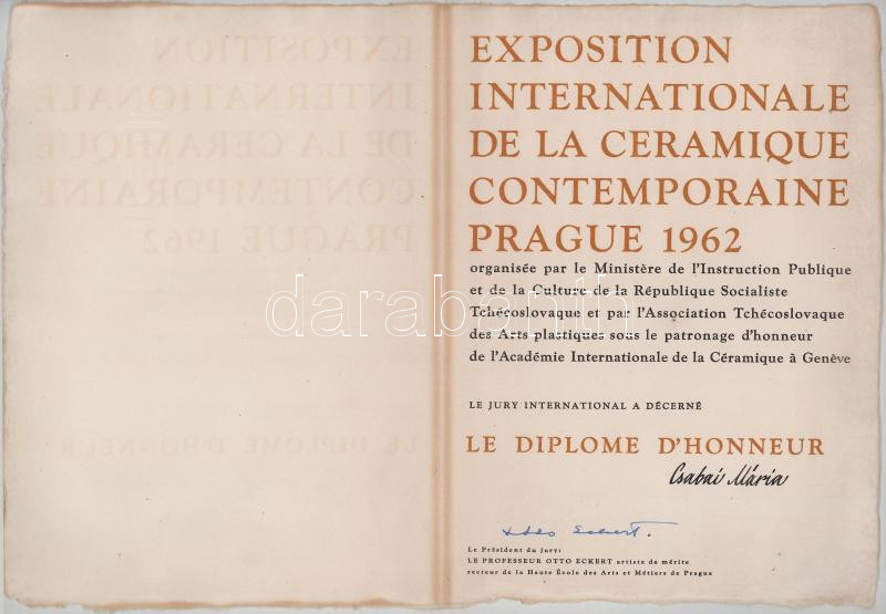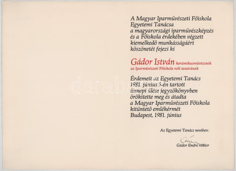 1962-1981 Gádor István, született Steiner István (1891-1984 ) kétszeres Kossuth-díjas magyar keramikus részére szóló 3 db elismerő oklevél. Nemzetközi kortárs kerámia kiállítás, Magyarországi művészképzésért végzett munka