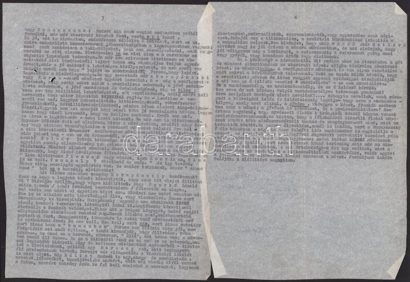 1968 Kristó Nagy István (1921-2010) kritikus, irodalom- és művészettörténész, műfordító által Hornyánszky Gyula festőművész kiállításán (VI. kerületi Hazafias Népfront képzőművészeti kiállítása) elmondott megnyitó beszéd gépelt kézirata, az utolsó lapon kézzel írt feljegyzéssel, 4 p.