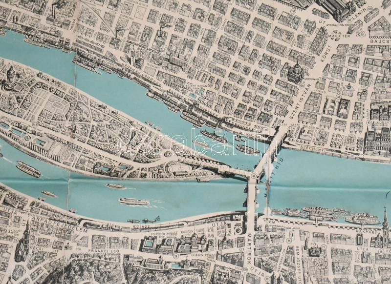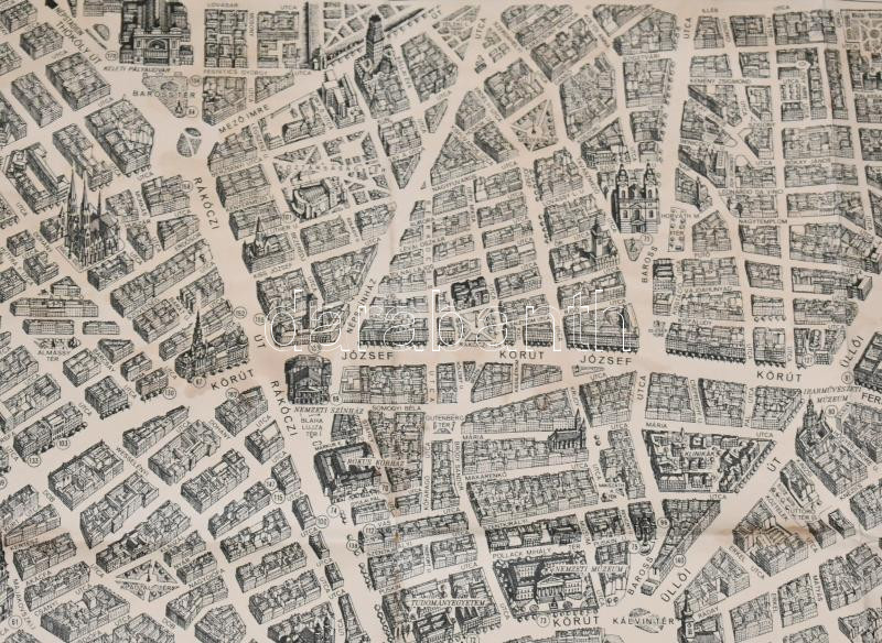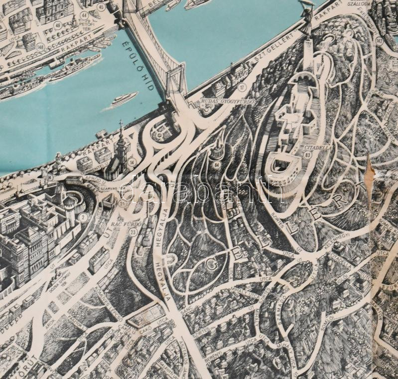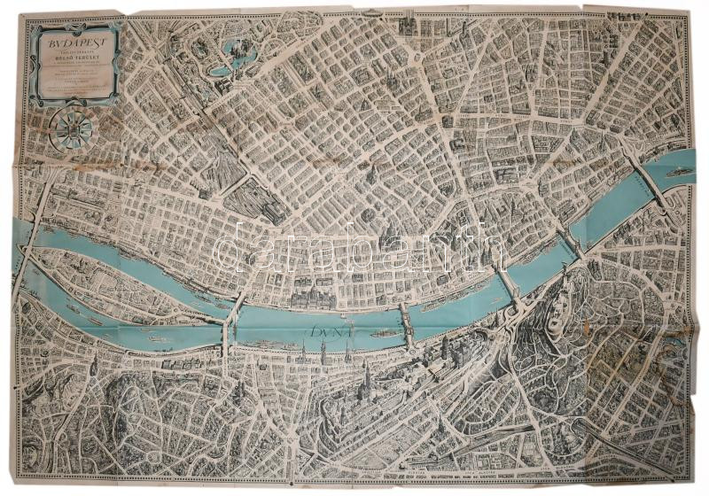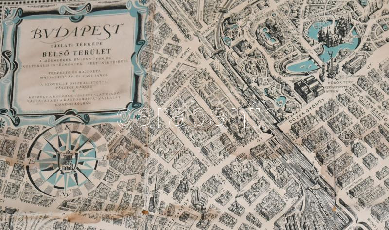 1963 Budapest távlati térképe, belső terület, tervezte és rajzolta: Mácsai István és Kass János, kiadja: Képzőművészeti Alap Kiadóvállalata, szakadásokkal, 81×114 cm