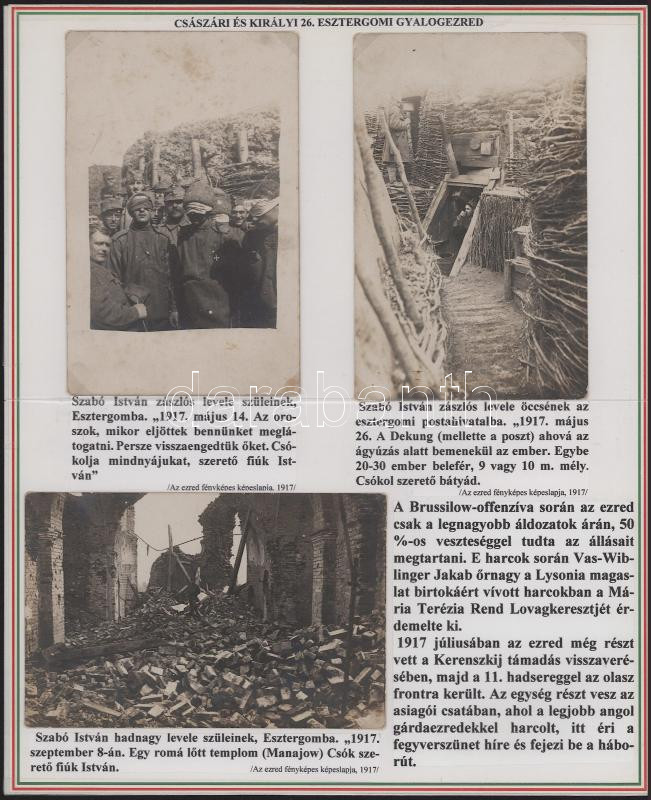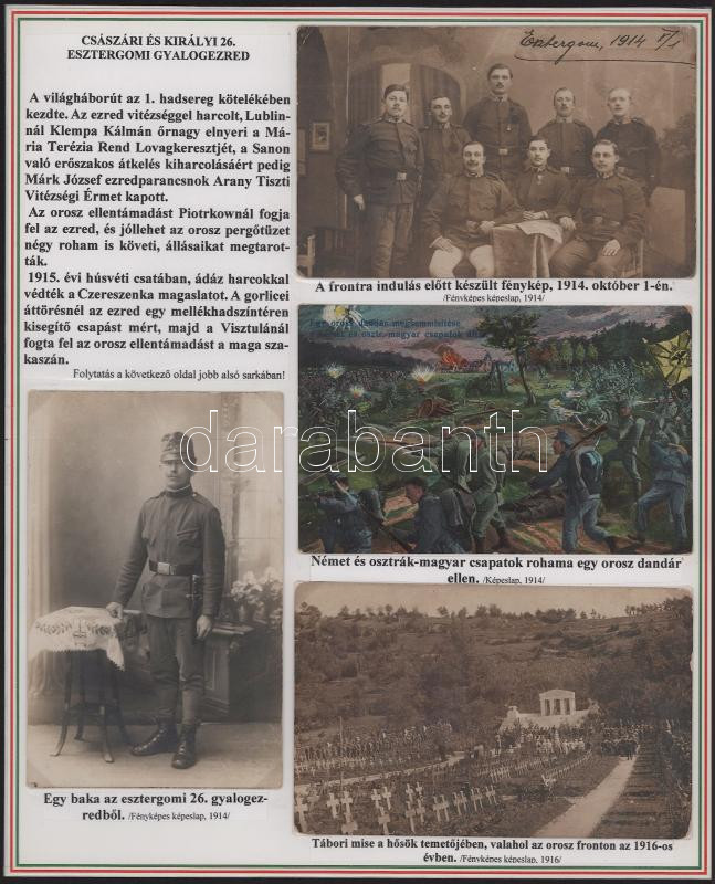1916 The collection presenting the k.u.k. 26th Esztergom Infantry Regiment consists of 10 original postcards and photos with accompanying texts, on panels. (The cards can be detached)