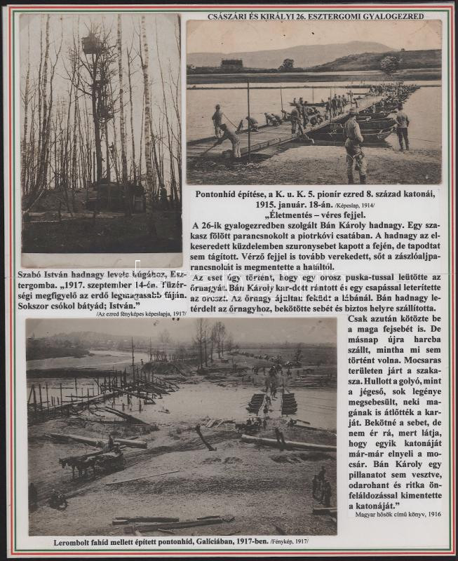 1914-16 A császári és királyi esztergomi 26. gyalogezredet bemutató gyűjtemény 10 db eredeti fotó, fotólap és képeslap kísérő szövegekkel, nemzeti szín szegélyű tablókon. (A képek leszedhetőek)