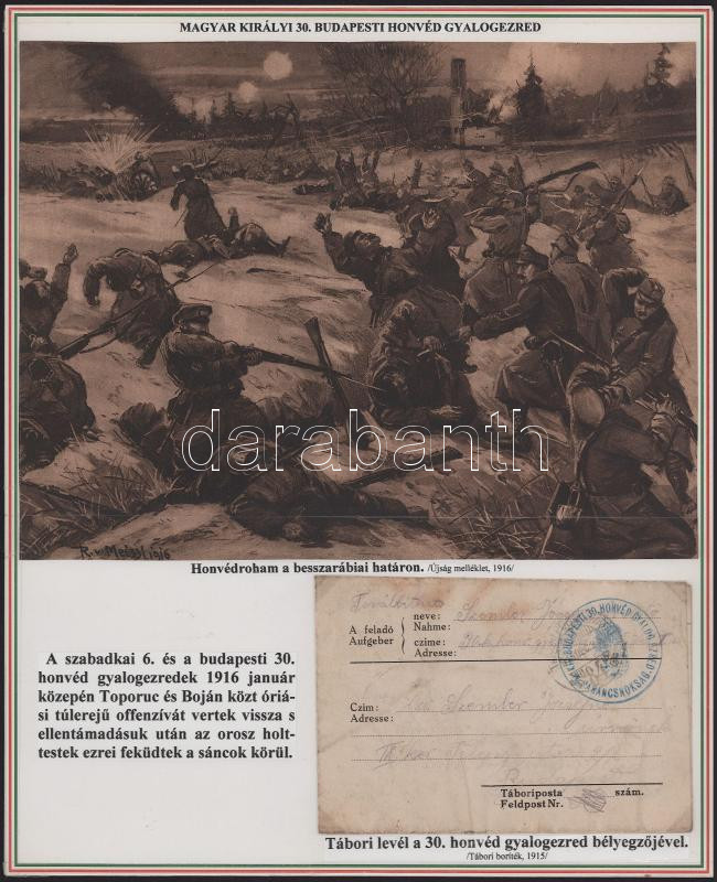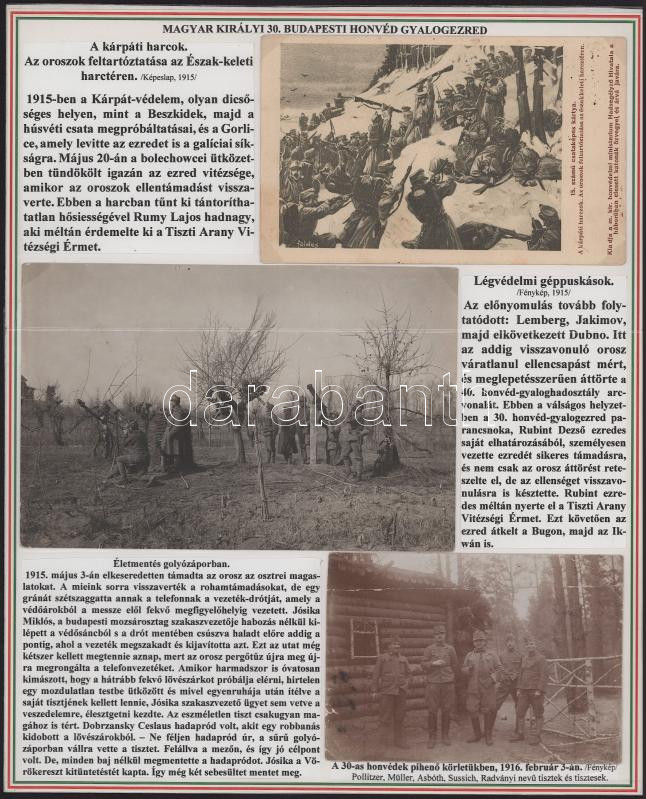 1914-18 The collection presenting the k.u.k. 30th Budapest Infantry Regiment consists of 18 original postcards and photos with accompanying texts, on 6 panels. (The cards can be detached)