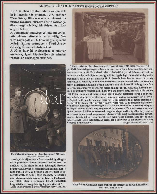 1914-18 A császári és királyi budapesti 30. honvéd gyalogezred történetét bemutató gyűjtemény 18 db eredeti fotó, fotólap, magyarázó szövegekkel. 6 db nemzeti szín szegélyű tablón. (A képek leszedhetőek) Szép és igényes összeállítás.
