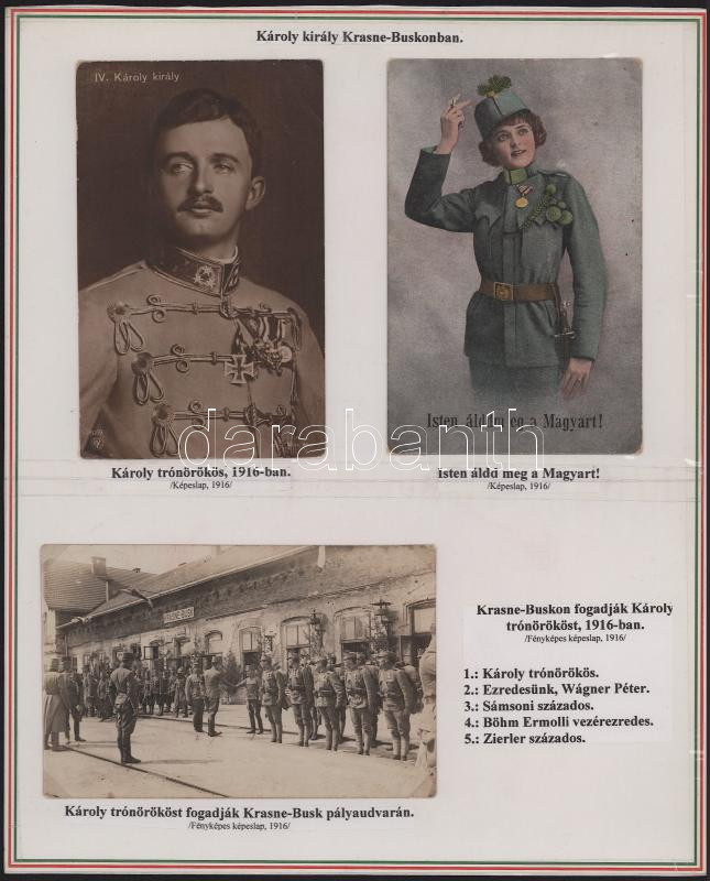 1916 Károly király Krasne Buskonban a fronton, eredeti fotó, a fogadó szereplők neveivel is, hozzá két eredeti képeslap