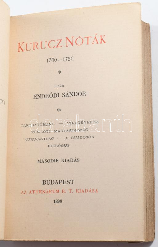 Endrődi Sándor: Kurucz nóták 1700-1720. Bp., 1898, Athenaeum. 285p. Kiadói bőr kötés, kopottas állapotban.