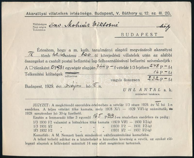 1929 Balaton Akarattya villatelek megvásárlási elismervény