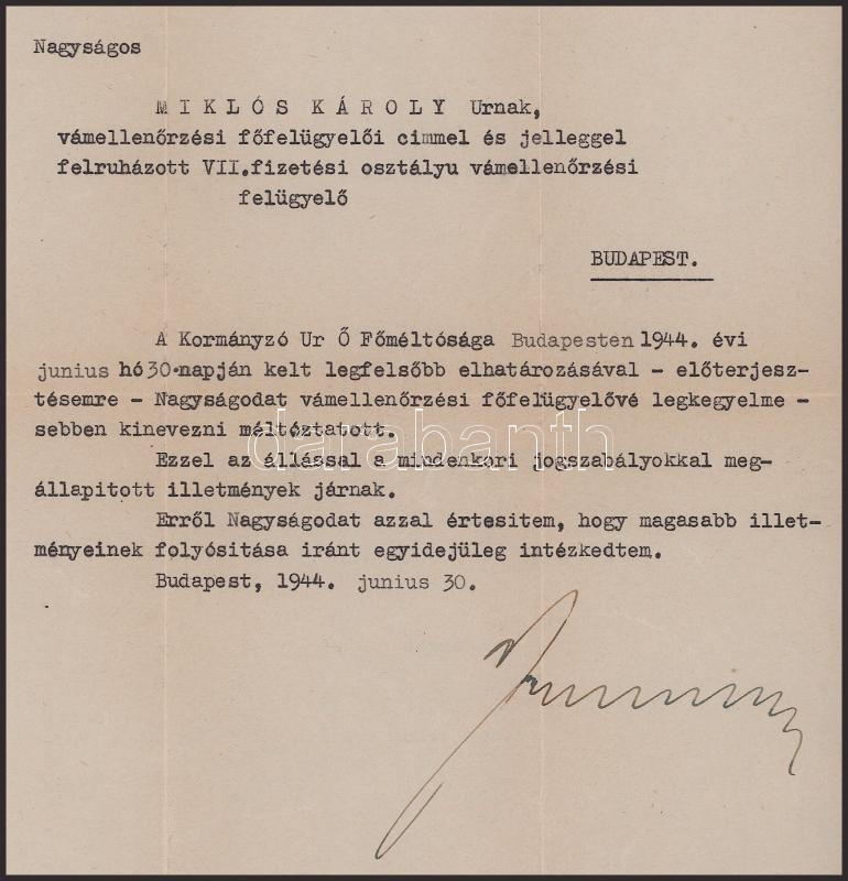 1944 Reményi-Schneller Lajos pénzügyminiszter aláírása kinevezési okmányon