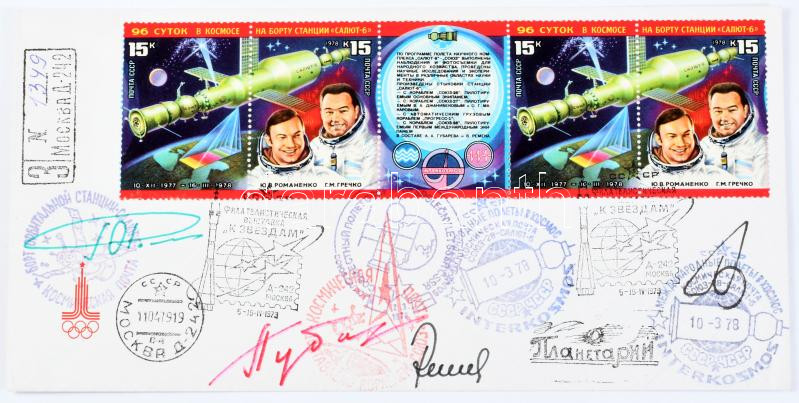 Alekszej Gubarev (1931-2015), Jurij Romanyenko (1944- ), Georgij Grecsko (1931- ) orosz és Vladimír Remek (1948- ) cseh űrhajósok aláírásai sorszámozott emlékborítékon / Signatures of Aleksey Gubarev (1931-2015), Yuriy Romanenko (1944- ), Georgiy Grechko (1931- ) Russian and Vladimír Remek (1948- ) Czech astronauts on limited number envelope
