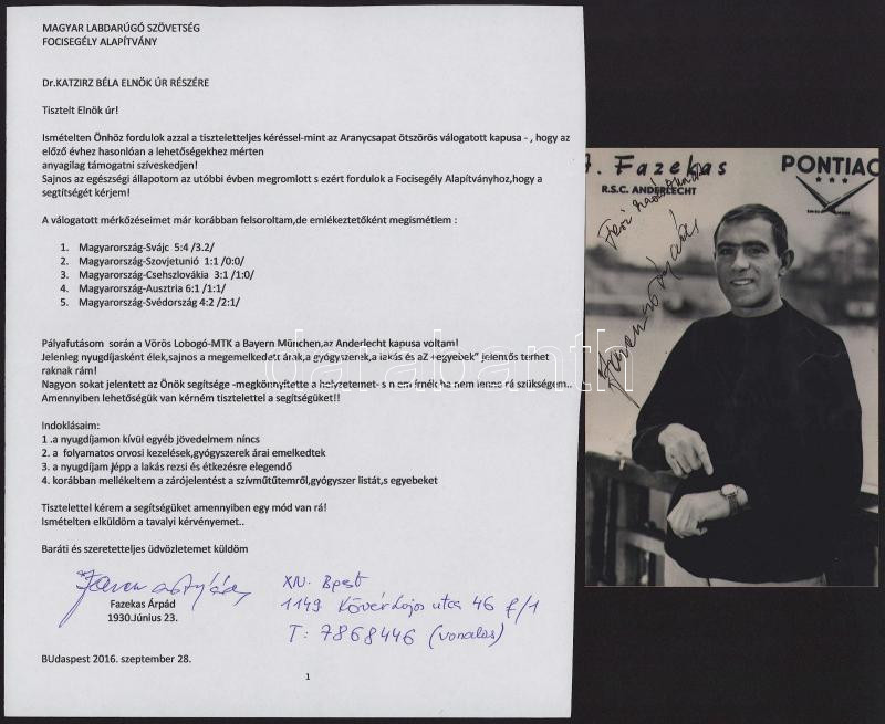 Fazekas Árpád (1930-2018) válogatott labdarúgó kapus, a Vörös Lobogó (MTK) és a Bayern München aláírása egy fotón és egy dokumentumon. + Fotók, az egyiken Ihász Kálmán (VASAS)