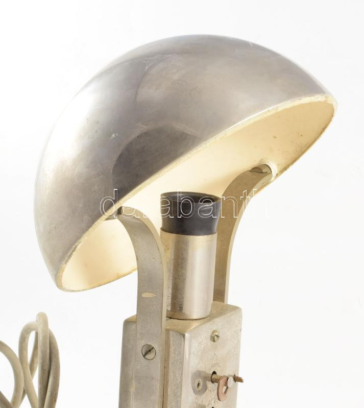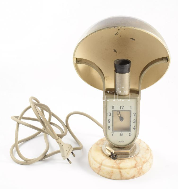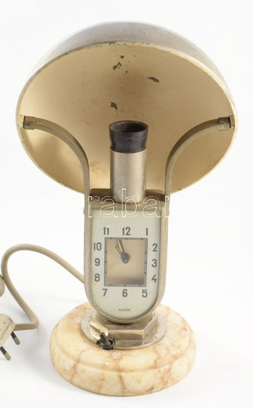 MOFÉM asztali lámpa beépített órával, nikkelezett fém, kopással, jó állapotban, m: 28 cm