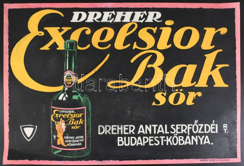 Dreher Excelsior Bak sör, Dreher Antal Serfőzdéi Rt. Budapest-Kőbánya, nagyméretű reklám, restaurált, 32,5×48,5 cm