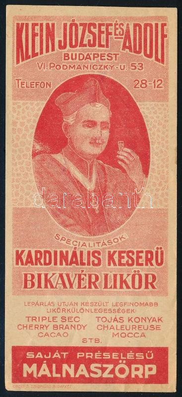Klein József és Adolf kardinális keserű bikavér likőr számolócédula