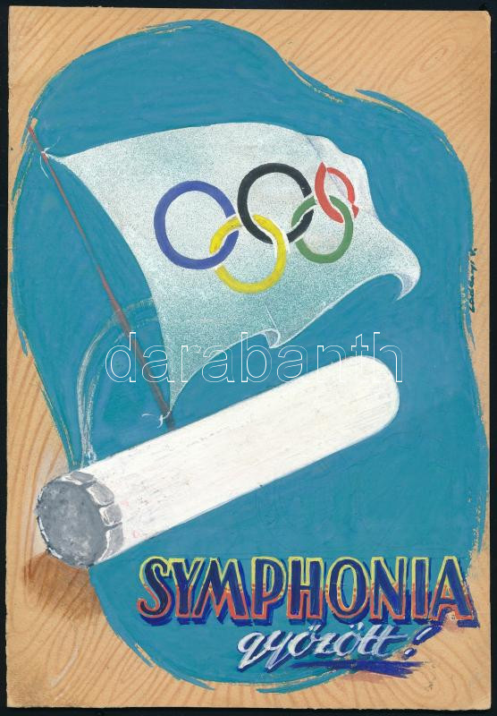 Ladányi József, működött a XX. sz. elején-közepén: Symphonia győzött, cigaretta reklám. Reklám- vagy plakátterv, 1950-es évek. Tempera, karton, jelzett, 14x20 cm