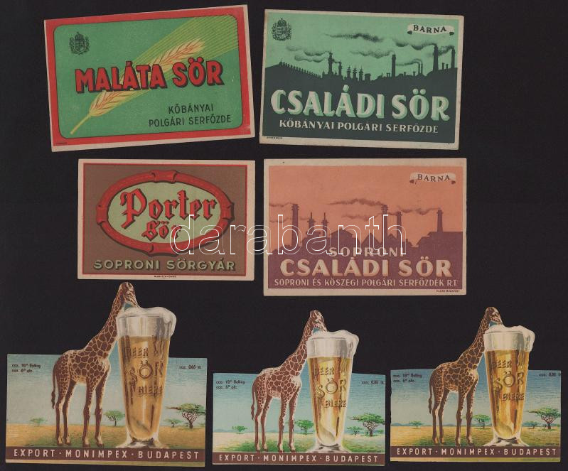 Vegyes sörcímke tétel (Monimpex Budapest, Soproni Családi Sör, Porter Sör, Maláta Sör, stb.), 7 db