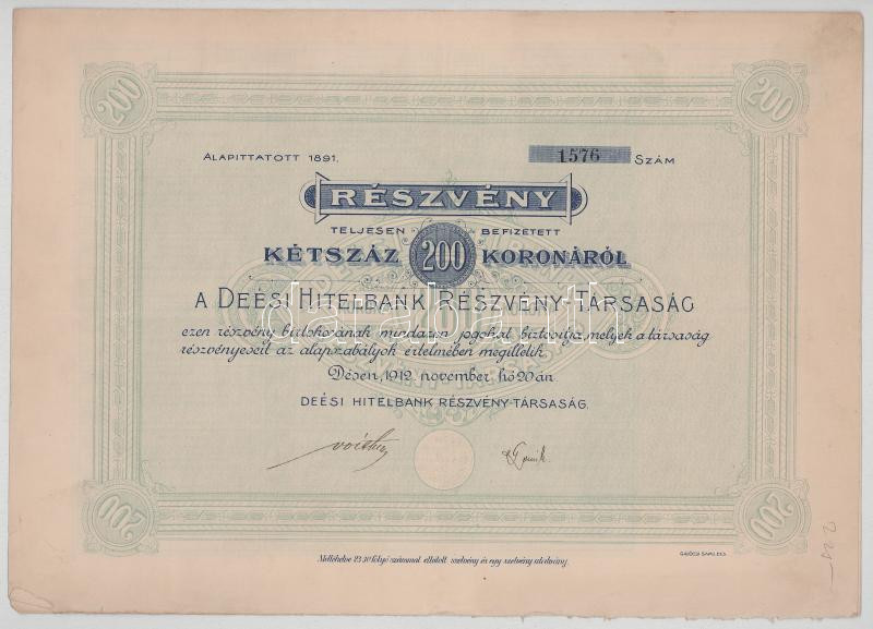 1912. Dés "Deési Hitelbank Részvénytársaság" részvénye 200K-ról, "1576" szelvényekkel, szárazpecséttel T:F