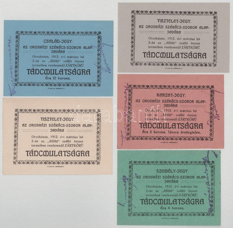 1912. Orosháza Tisztelet-jegy a Székács-szobor alap javára, az "Alföld" szálló összes termeiben rendezendő zártkörű táncmulatságra (5xklf) T:AU