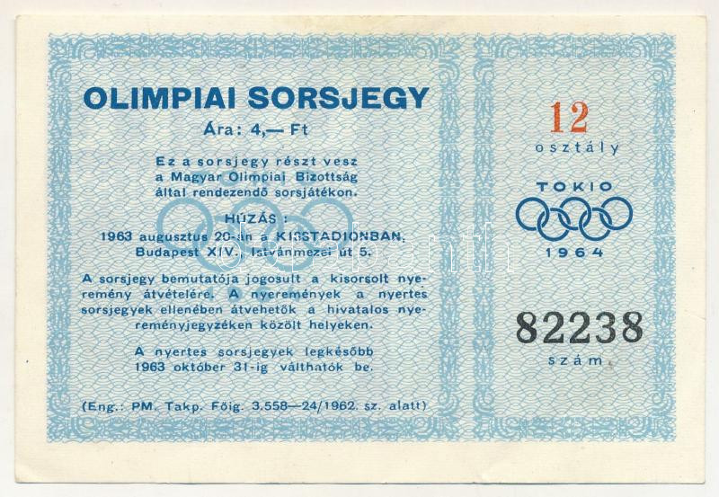 1963. "Olimpiai Sorsjegy - Tokio 1964" 12 osztály sorsjegye 4Ft értékben, "82238" sorszámmal T:F szép papír