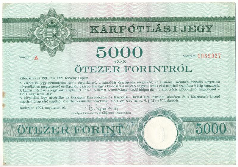 1991. Budapest "Országos Kárrendezési és Kárpótlási Hivatal" kárpótlási jegye 5000Ft-ról "1089927", "A" sorozat, szárazpecséttel T:F fo.