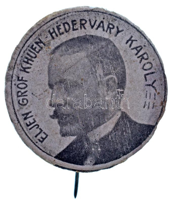1900 k. "Éljen Gróf Khuen-Héderváry Károly" fém jelvény papír nyomattal (35mm). Gróf Khuen-Héderváry Károly 1849-ben született Gräfenbergben (ma: Lázně Jeseník, Csehország). Középiskolai tanulmányait a pesti piarista és a pécsi ciszterci gimnáziumban végezte, majd érettségi után a zágrábi jogakadémián volt hallgató. 1882-ben győri főispánná nevezték ki, majd 1883. december 1-jén Horvát-, Szlavón- és Dalmátország bánjává nevezték ki, e tisztségét húsz éven keresztül megtartotta. Előbb a horvát, majd a magyar országgyűlés tagja. Horvátországban erőszakos magyarosítást hajtott végre, a magyar nemzeti szimbólumok elterjesztésével és a magyar nyelv használatának kiterjesztésével. 1903. júniusától novemberig a Magyar Királyság miniszterelnöke, majd a király személye körüli miniszter 1904. és 1905. között. Ezután, még egyszer nyílott lehetősége kormányt alakítani, 1910. január 17-én, de már a Nemzeti Munkapárt színeiben, aminek egyik alapítója volt. A parlamentben gyakran erőszakos eszközökkel harcolt az ellenzék ellen, aminek következtében végül 1912. április 22-én lemondani kényszerült. 1918-ban Budapesten hunyt el. Bár a nemzetiségek körében a magyarosítás miatt népszerűtlen volt, sokak szemében a dualizmus stabilitásának egyik meghatározó politikusa. T:VF